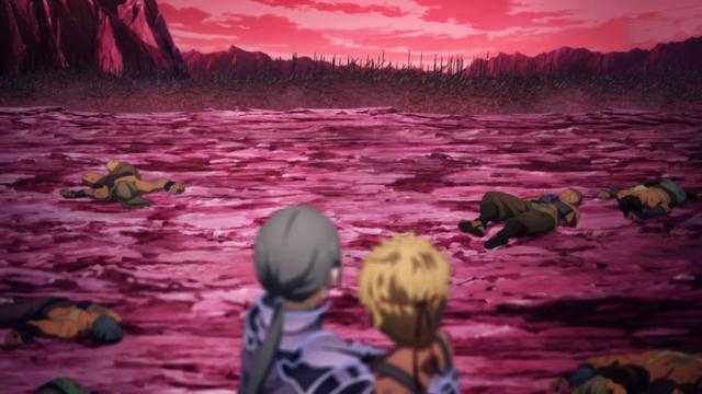 比如說敵我雙方巨大的數量反差,數千對上數萬,聽起來就獲勝的希望就比較渺茫。而在最直觀的戰鬥背景上面,動畫也刻意將其更換為深紅色,從第一印象就給人一種宛如「末日」般的感覺。