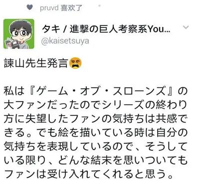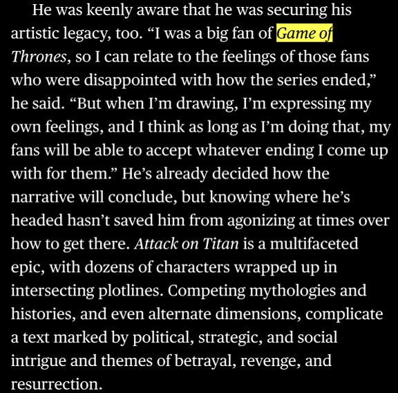 他表示相信大家能夠接受巨人的結局。"我曾經是「權力的游戲」的鐵粉,所以我能理解對於權游結尾很失望的粉絲的感受,但是在我畫巨人時候,我在表達著我自己的感受,並且我相信只要我繼續這樣畫下去,我的粉絲們能夠接受我畫的任何結局。"