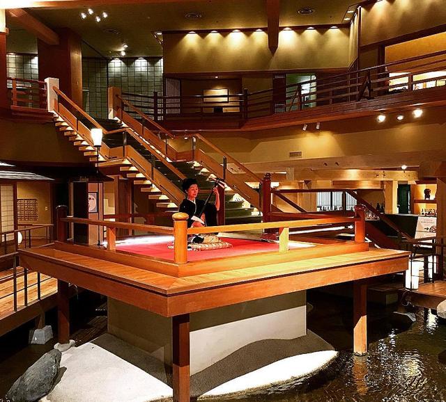 這家溫泉旅館雖然說在整體上來看並不及無限城復雜,也缺少神秘感,但是從建築風格(樓梯、回廊)上來看,這個旅館還是非常“神似”無限城的,旅館中間還有一個專門提供給伶人表演的小舞台,剛好對應了鳴女彈琵琶的那個地方,聲音能夠傳達到旅館的任何一個地方,換做是鳴女的血鬼術的話,那就是能夠操控旅館的任何一個地方了。