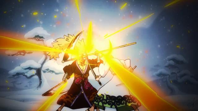 索隆和基拉不僅近身互劈,還遠程放波。可惜,對於兩人而言,對方的斬擊波都沒啥傷害。牛鬼丸靜靜看著兩人激戰,直到發現索隆露出了破綻,直接出手偷襲了索隆。索隆雖然注意力放在基拉身上,但還是躲避了牛鬼丸的偷襲。