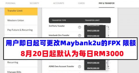Maybank2u用户即日起可更改FPX 每日限制设置
